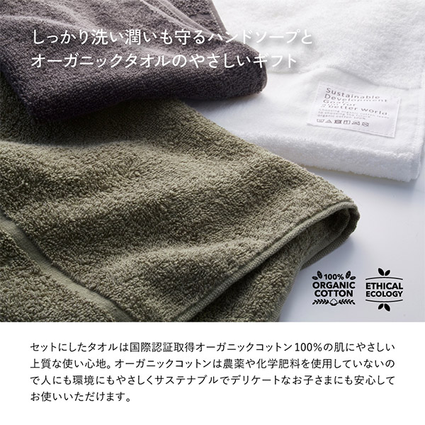 オレンジ&ハーブのおしゃれで爽やかなフレーバーがふわっと香り、手肌を清潔にしっとりと洗い上げるハンドソープ「ORANGEY」。香りや使用感にもこだわった医薬部外品の薬用ハンドソープとオーガニックコットン100%のタオルセットです。オーガニックコットンは農薬や化学肥料を使用していないので人にも環境にもやさしくサステナブルでデリケートなお子さまにも安心してお使いいただけます。
