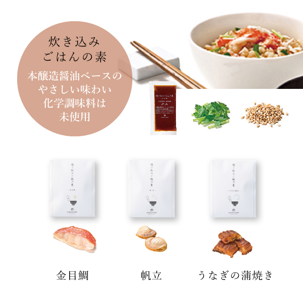 3種の炊き込みご飯が楽しめる、美しい風呂敷に包まれた炊き込みご飯の素セットです。「金目鯛」「帆立」「うなぎの蒲焼き」の詰め合わせ。ゴロっと食べ応えのある具材に三つ葉と白煎りごまがアクセントになり、より一層炊き込みご飯の美味しさを引き立てます。化学調味料を使用せず本醸造醤油をベースに、国産鶏、日高産昆布、焼津産鰹エキスで、風味豊かに仕上げたやさしい味わいが特徴です。