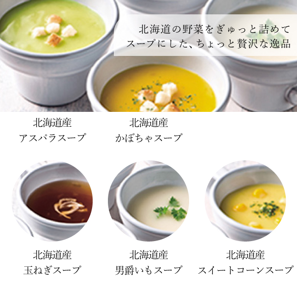| 北海道産かぼちゃスープ16.5g×2、北海道産玉ねぎスープ7g×2、北海道産男爵いもスープ20g×2、北海道産スイートコーンスープ16.5g×2、北海道産アスパラスープ16.5g×2 |