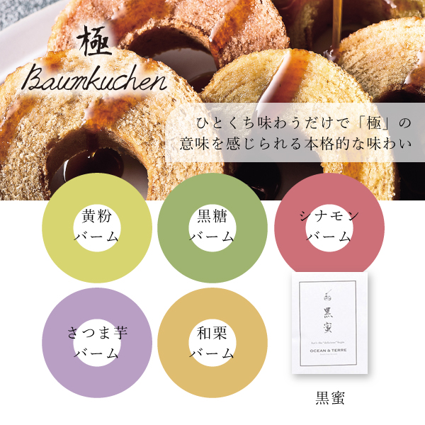 和を味わえるバームクーヘン。ひとくち味わうだけで「極」の意味を感じられます。「黄粉」「黒糖」「シナモン」「さつま芋」「和栗バーム」の5種類。黒蜜をかけると、より一層美味しくお召し上がりいただけます。シンプルなデザインのパッケージで、どなたに贈っても喜ばれる一品です。