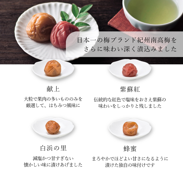 | 献上 紀州南高梅17g×2、蜂蜜 紀州南高梅7g×2、紫蘇紅 紀州南高梅7g×2、白浜の里 紀州南高梅7g×2、鹿児島県産 かぶせ茶ティーバッグ2g×10、静岡県牧之原産 深むし茶ティーバッグ2g×10、静岡県産 煎茶ティーバッグ2g×10 |