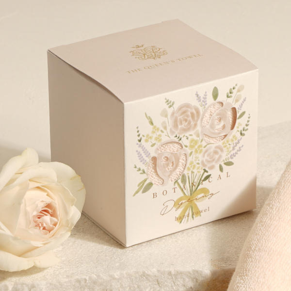 キューブ型が特徴のパッケージにはブーケのデザインをあしらい、繊細なカットから覗くハンドタオルとの調和が美しく仕上がっています。まるでお花を貰ったような気持ちにしてくれる、優しさと華やかさが伝わるデザインにこだわりました。