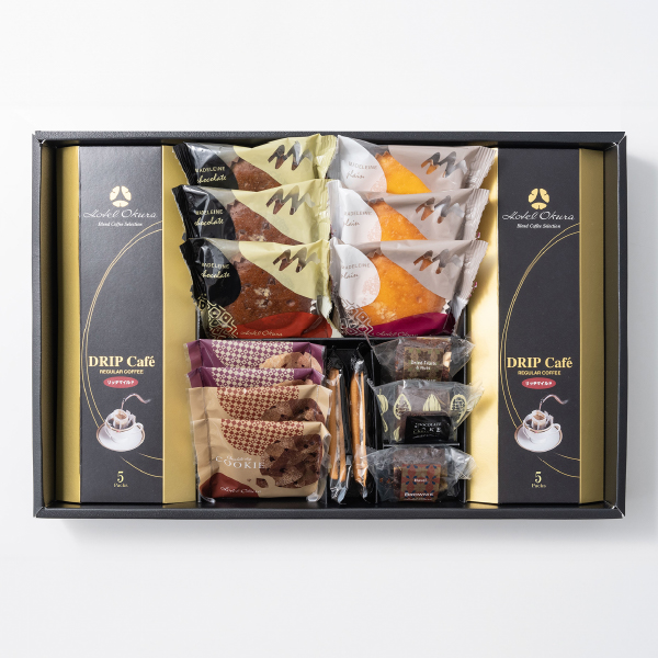 ホテルオークラの焼菓子とドリップ珈琲の詰合せ。しっとりした焼きあがりのマドレーヌやレーズンサンドなどさまざまな焼菓子を取り揃えているのにも、選ぶ、味わう楽しさを届けたいというおもてなしの心を感じて頂けるセットとなっています。焼菓子に良くあう上品な味わいのドリップ珈琲と一緒にご堪能ください。