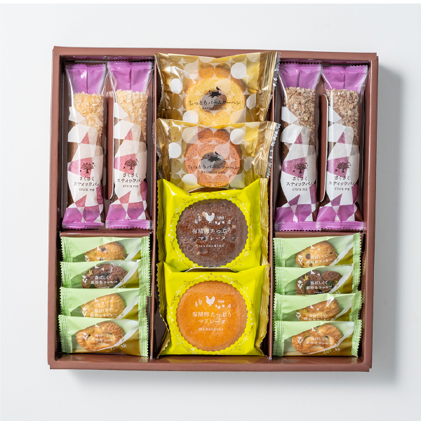 | しっとりバームクーヘン・しっとりバームクーヘン苺×各1、有精卵たっぷりマドレーヌ(プレーン・ショコラ×各1)、香ばしくて素朴なクッキー(ミルク・ショコラ・メープル・チョコチップ×各2)、さくさくスティックパイ(メープル・ショコラ×各2) 合計16個 |