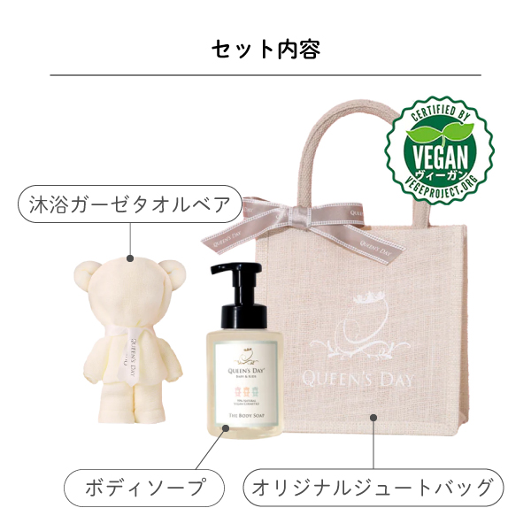 | ボディソープ380ml×1 沐浴ガーゼタオルベア×1 オリジナルジュートバッグ×1 |