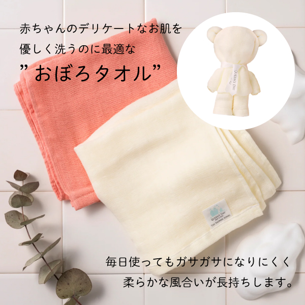 沐浴ガーゼは江戸時代から愛されている「おぼろタオル」を使用。吸水性、速乾性に優れており、沐浴ガーゼにぴったりな素材です。薄手ですぐに乾くので毎日のお洗濯もラクラク♪驚くほどの柔らかさと、軽さで使い心地もよく生まれたての赤ちゃんのお肌をしっとり優しく洗いあげます。