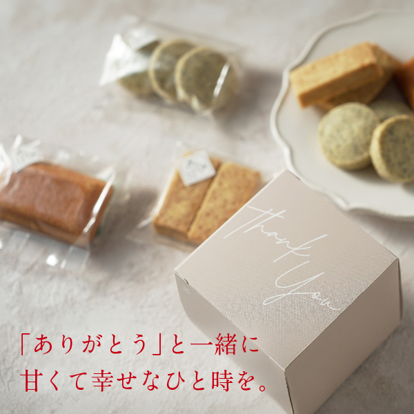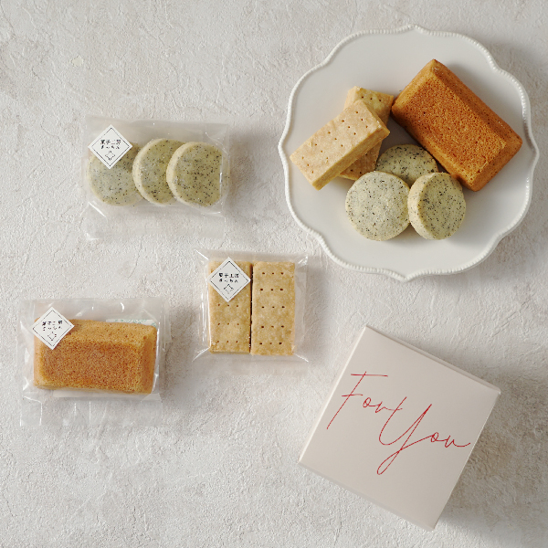 キューブ型の可愛らしいフォルムのパッケージに、フィナンシェ、ショートブレッド、サブレの3種類の焼菓子を詰め合わせました。
