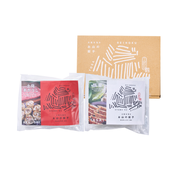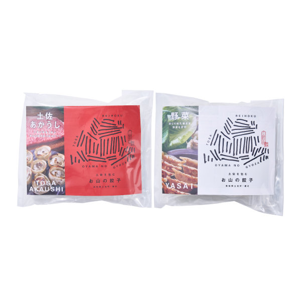 肉は程よいサシが入り、噛むほどに味わい深い赤身肉である土佐あか牛のみを使用し、独特の包み方で旨みを閉じ込めた「土佐あかうし餃子」と、自社で野菜の栽培を行い、収穫後すぐ加工する事で独特の野菜の旨みやシャキシャキ感を残した「野菜餃子」のセットです。