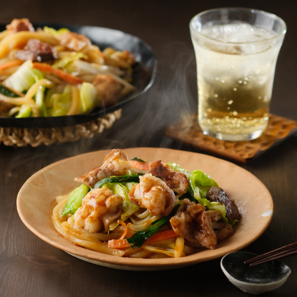 岡山県北部では古くから畜肉産業が盛んで、肉食が禁止されていた時代にも「養生喰い」として食されていました。日常的に新鮮なホルモンが手に入る、そんな文化の中から生まれたホルモンうどんは、津山地域の50軒以上のお店で提供されているソウルフードです。モチモチのうどんに染み込んだ甘辛いタレとホルモン・野菜の甘みと相性が抜群です。