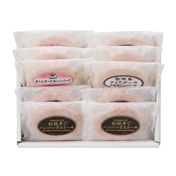 | 松阪牛入(31%使用)生ハンバーグ120g×4個、松阪牛・さくらポーク生ハンバーグ120g×3個、さくらポーク生ハンバーグ120g×3個 |