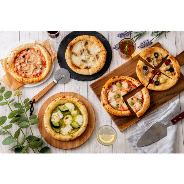 | スモークチキンとローストきのこのトマトピザ・まるずわいがにとだだ茶豆のトマトピザ・アンチョビとローストガーリックのピザ・魚介たっぷりのマリナーラピザ・ローストいかのジェノベーゼピザ×各1枚(直径約15cm) |