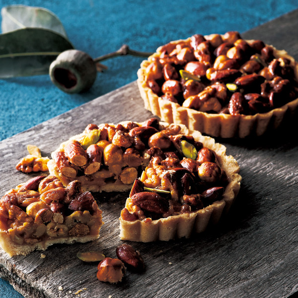 【ヘーゼルナッツキャラメルタルト】ヘーゼルナッツ、アーモンド、くるみを贅沢に使用したタルト。キャラメルで包んだはちみつの優しい甘さとナッツの香ばしさが一口目から広がります。