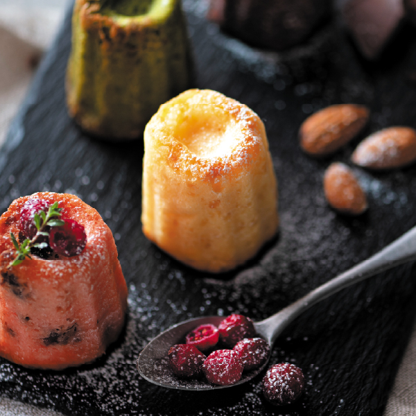 【クグロフティノ】しっとりとした食感にドライフルーツやナッツの風味が口いっぱいに広がります。アーモンド、チョコ、抹茶、クランベリーの4種類の色とりどりのクグロフです。