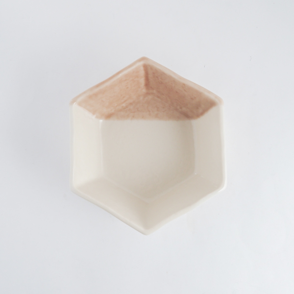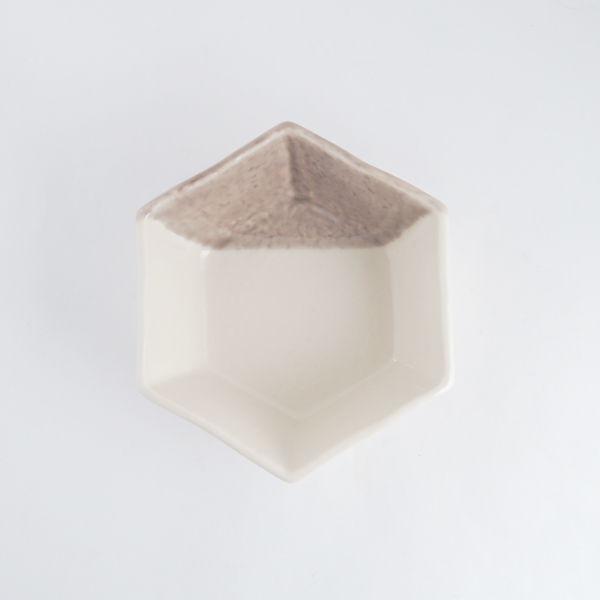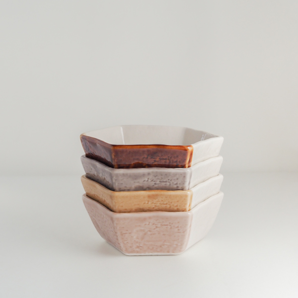 シンプルながら可愛らしい六角形が特徴の中鉢と箸、箸置きの「ローズ」と「グレーパープル」の2色セット。六角形は、古くから縁起がいいとされている形で、お祝いごとでの贈り物にぴったり。