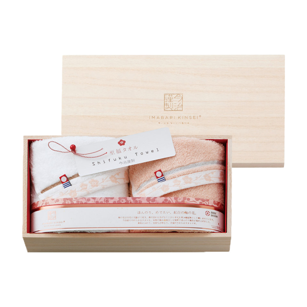 令和の元号と縁が深い「梅」でていねいに染め上げられた紅白のフェイスタオルセットです。本物の梅から抽出した染料でほんのり梅色に染め上げやさしい風合いに仕上げています。糸を甘撚りにすることで柔らかい手触りに仕上げ、手にしたときの軽やかさとふんわり感が伝わるタオル。肌に触れるものだから品質にこだわり、心をこめて美しい木箱にやさしくそっと詰めました。