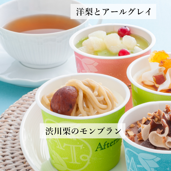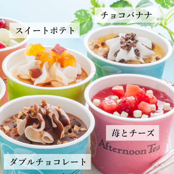 | (洋梨とアールグレイ・苺とチーズ・スイートポテト・チョコバナナ・ダブルチョコレート)各103ml×各1、渋皮栗のモンブラン94ml×1(計6) |