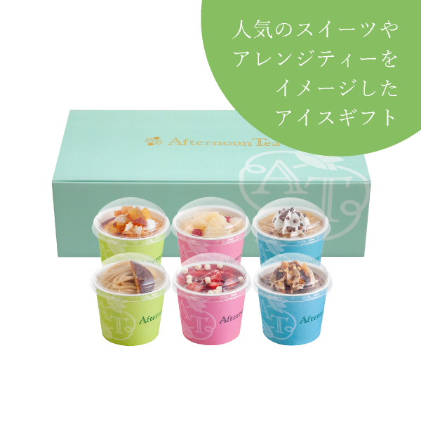 全国に店舗を展開する「アフタヌーンティー・ティールーム」の華やかなアイスギフト。店舗で人気のスイーツメニューやアレンジティーをイメージした6種類の詰合せです。