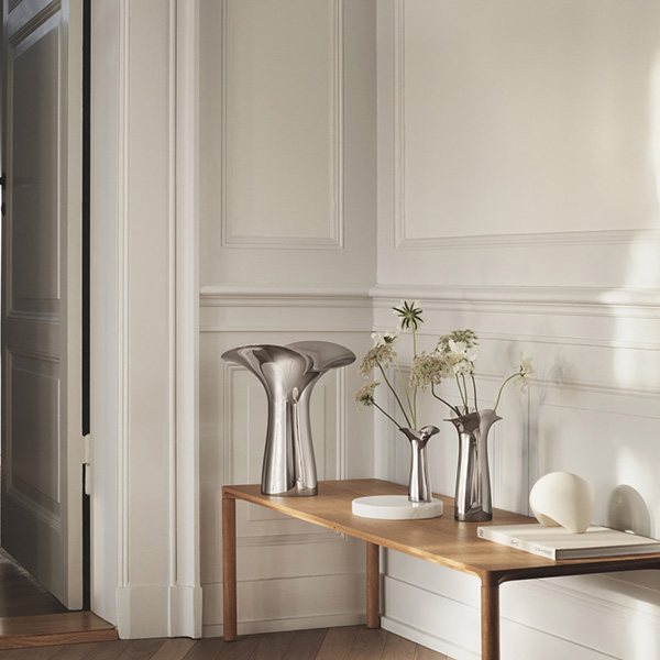 ステンレスでありながら有機的な温かみや触感を感じさせ、彫刻的な美しさを放つヴェースはテーブルや窓辺へ気軽に飾る事ができます。