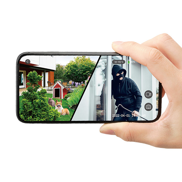 スマートフォンに通知が届き、離れた場所でもお手元のスマートフォンで映像確認ができます。いつでもリアルタイムでカメラ映像を見ることができ、静止画や動画をスマートフォンに保存することができます。防犯対策、害獣確認、ペットやお子様の見守りカメラとして暮らしの安全・安心をサポートします。防雨タイプで屋外でも設置可能です。