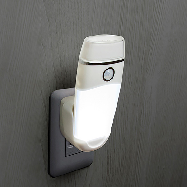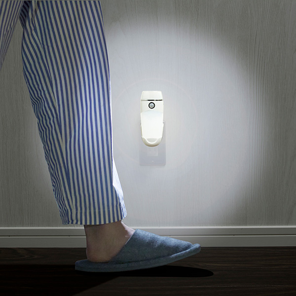 人が近づくと明るく自動点灯。約20秒後に消灯(人がいる間は点灯が延長)※コンセントにさして使用。