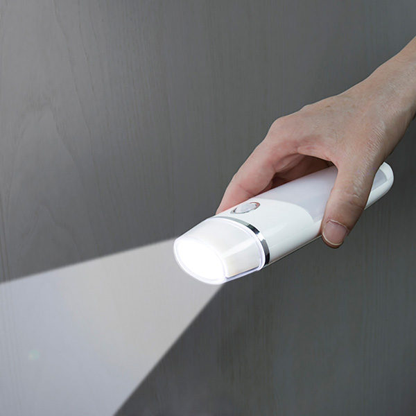 懐中電灯=手に取るとパッと点灯。2種類の光るモード。高輝度LEDであかるい。