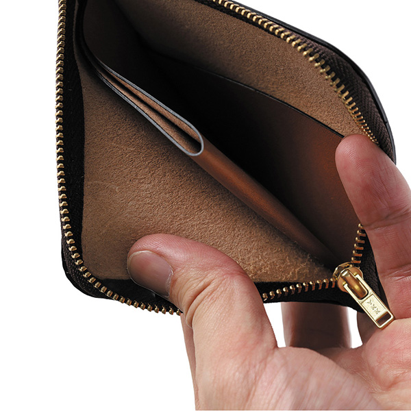 機能性と洗練されたデザインを兼ね備えたアイテムです。スリムながらもカード、紙幣、小銭をしっかり収納できる設計で、使い勝手が抜群。L字型ファスナーはスムーズな開閉を実現し、日々の使用でストレスフリーな体験を提供します。