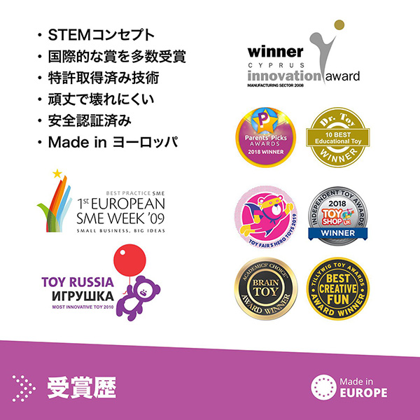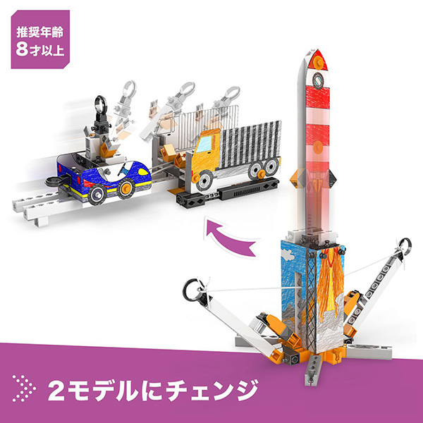 米国特許を取得した、あらゆる方向から3Dでの組み立てができる独自のスナップフィット構造を採用。従来のブロックの縦や横への取り付けに加え、伸縮したり、可動域を与えたりといった、柔軟な設計を可能にします。複雑な構造も再現しやすく本格的な模型作りができるほか、お子さまの創造力で説明書にないものを自由に作り上げることができる、エンジニアリングに特化したブロックです。