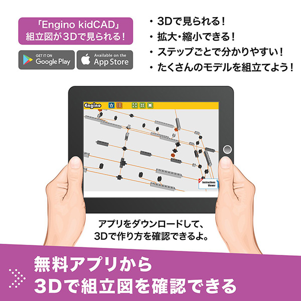 作れる模型は「衝突試験」「ロケットランチャー」の2種類です。本品付属のガイドブック、ウェブサイト、または専用アプリ「EnginoKidCAD」で組み立て方法が確認できます。2種類の模型で様々な実験に取り組むことができるので、1つのキットで長くお楽しみいただける構成です。