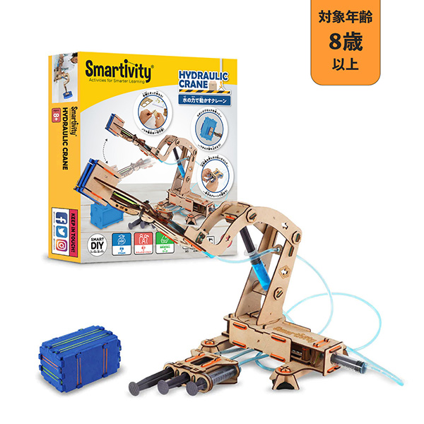 インド発!水圧を用いて操作する「水の力で動かすクレーン」を組み立てて油圧システムやクレーンの仕組みついて学べるDIY式のSTEAM知育玩具となっています。