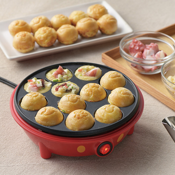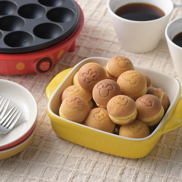 ミッキーマウスデザインの電気たこ焼き器。プレートにミッキーのモチーフとなるアイコンを散りばめ焼き上がりがキュートになります。