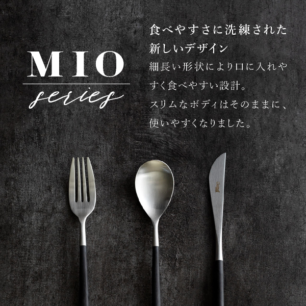 北欧食器はもちろん和食器との相性も良いブラック×シルバーに、ミオの柔らかな曲線がプラスされたミオ・ブラック。クチポールらしいスタイルをキープしつつ、ミオの丸みのあるフォルムが親しみやすい印象のカトラリーに仕上げています。普段使いはもちろん、おもてなしの席に使えばゲストに一目置かれる存在になりそうです。