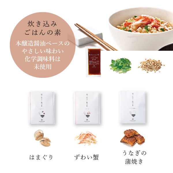 素材の美味しさが詰まった炊き込みご飯の素3食セットです。見た目も豪華な「はまぐり」や、「うなぎの蒲焼き」「ずわい蟹」の詰め合わせ。三つ葉と白煎りごまが付いており、より一層炊き込みご飯の美味しさが引き立ちます。化学調味料を使用せず本醸造醤油をベースに、国産鶏、日高産昆布、焼津産鰹エキスで、風味豊かに仕上げたやさしい味わいが特徴。2合用なのでご夫婦や家族、一人暮らしの方にもおすすめです。