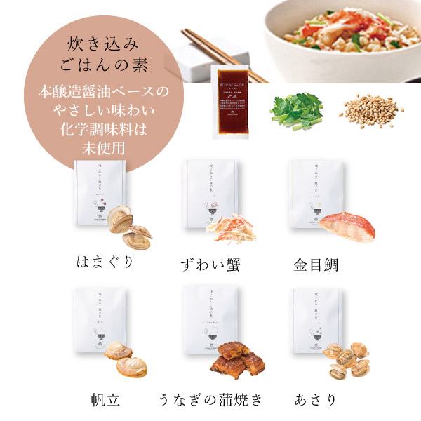 | 炊き込みご飯の素38g(2合用)×6、はまぐり2個×1、ずわい蟹13g×1、金目鯛1切×1、帆立2~4個×1、うなぎの蒲焼き13g×1、あさり30g×1、三つ葉0.2g×6、白煎りごま1g×6、お吸い物の素2.9g×6、はまぐり2個×1、ずわい蟹13g×1、帆立2~4個×1、紀州南高梅1粒×1、あさり30g×1、宍道湖しじみ30g×1、白煎りごま1g×6 |