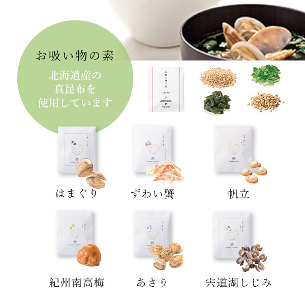 海鮮を使った炊き込みご飯とお吸い物のセットです。三つ葉と白煎りごまが付いており、より一層炊き込みご飯の美味しさが引き立ちます。北海道産真昆布を使用し、海鮮で深い旨味を加えた、潮風を感じるお吸い物は、「はまぐり」「ずわい蟹」「金目鯛」「帆立」「うなぎの蒲焼き」「あさり」の6種類の詰め合わせ。セットの白煎りごまを振れば、さらに違った味わいをお楽しみいただけます。口の中に広がる自然の恩恵を感じてください。