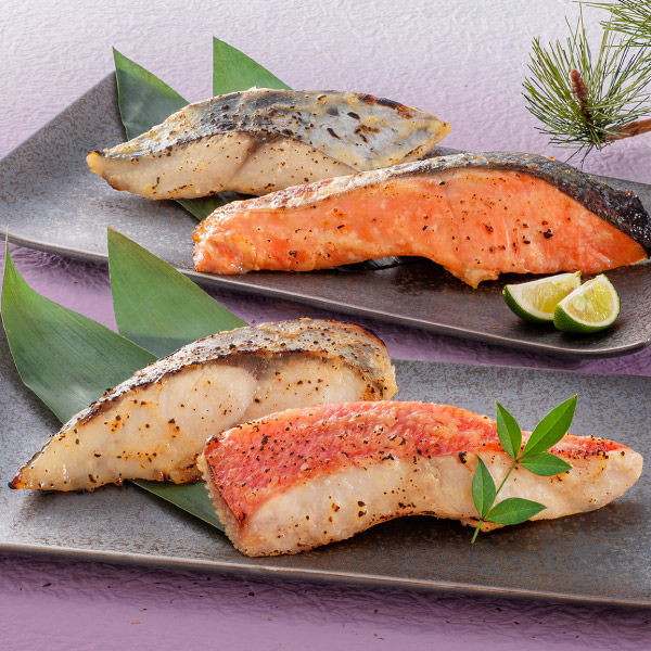 | 金目鯛、銀ひらす(ニュージーランド産)・銀鮭(チリ産)・さわら(韓国産)各60g×各2(計8) |