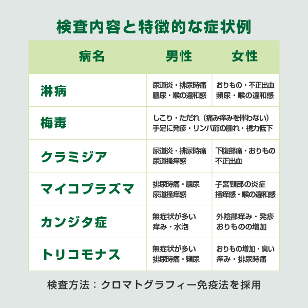 淋菌・梅毒・クラミジア・マイコプラズマ・カンジダ・トリコモナスの6種類をその場で一度に検出、確認できます。