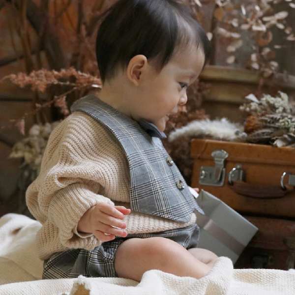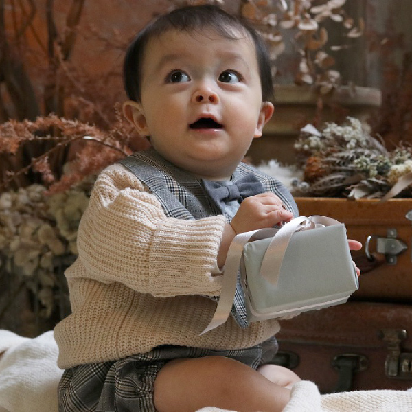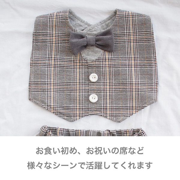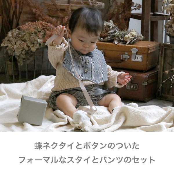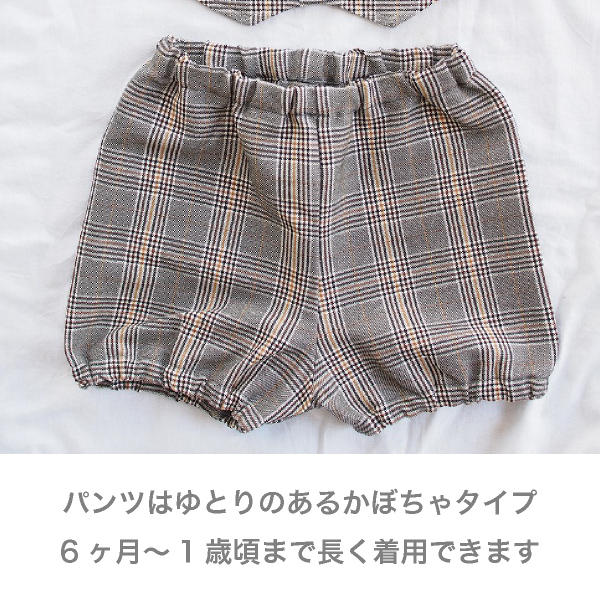 スタイはスナップボタンで着脱もかんたん!パンツはたっぷりゆとりのあるかぼちゃパンツ。ウエスト、裾はやわらかいゴム入り。腰回りのゆとりも多く、1歳くらいまでは十分着用いただけるので、ハーフバースディや出産祝いなどのプレゼントにもおすすめです。結婚式やパーティ・フォーマルな場にも♪