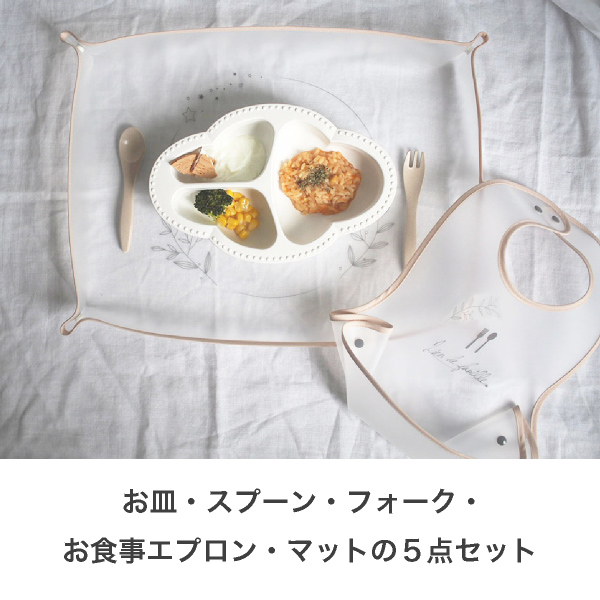 プレートにカトラリー2本、お食事エプロンとマットが付いた赤ちゃんのお食事セット。