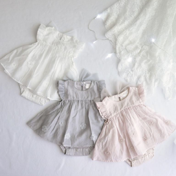 さりげないお花の刺繍もとってもキュートでエレガント。姉妹でお揃いにしても可愛いですよ。