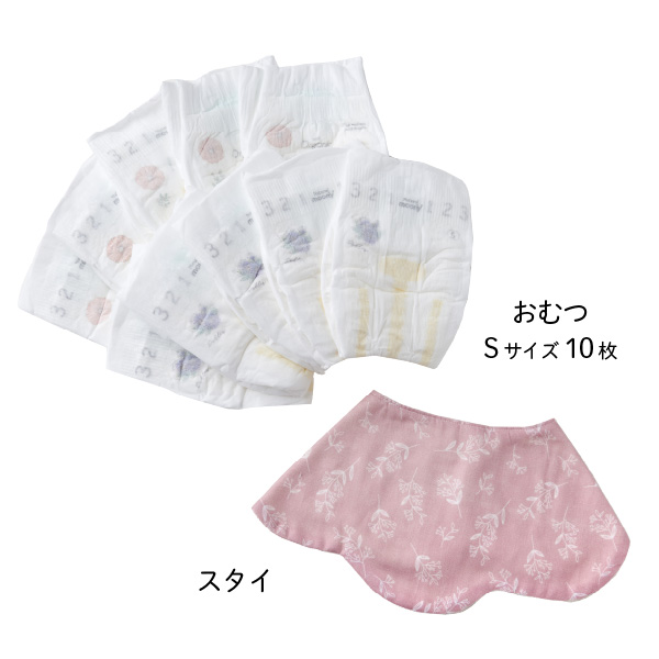 | ・おむつ10枚(テープSサイズ/ナチュラルムーニー) ・スタイ |
