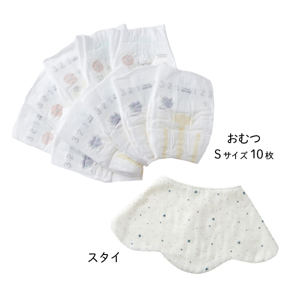 | ・おむつ10枚(テープSサイズ/ナチュラルムーニー) ・スタイ |