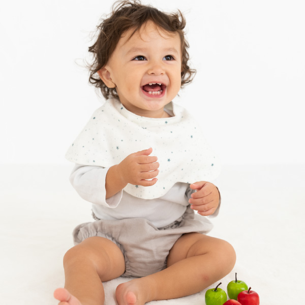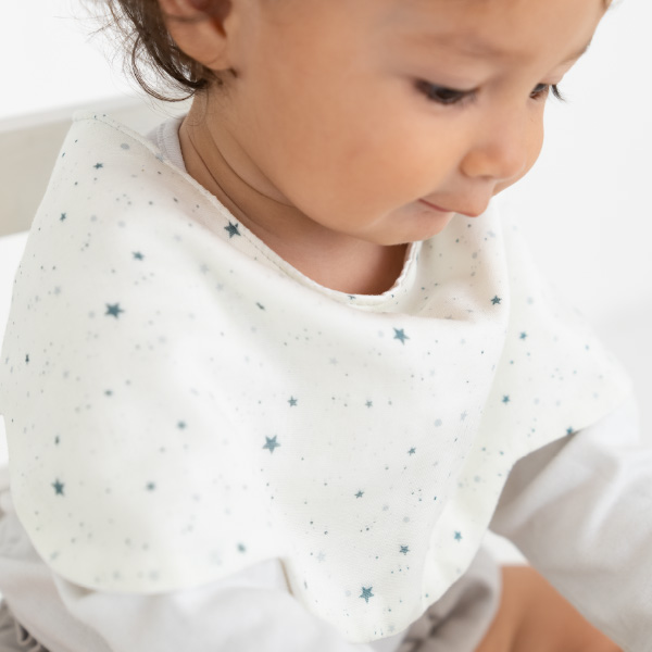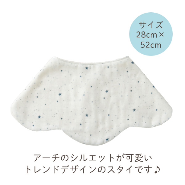 スタイには、清潔感溢れるオフホワイトにさりげない星が散りばめられており男の子、女の子どちらのプレゼントにもおすすめです。ラウンドスタイは、動きが活発なお子さまに最適です。どの面でもよだれをしっかりとキャッチしてくれます。