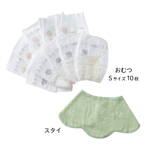 | ・おむつ10枚(テープSサイズ/ナチュラルムーニー) ・スタイ |