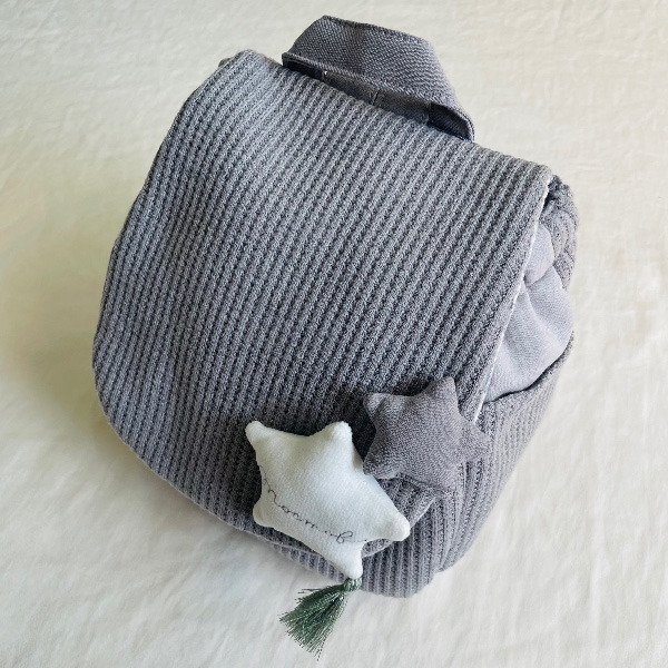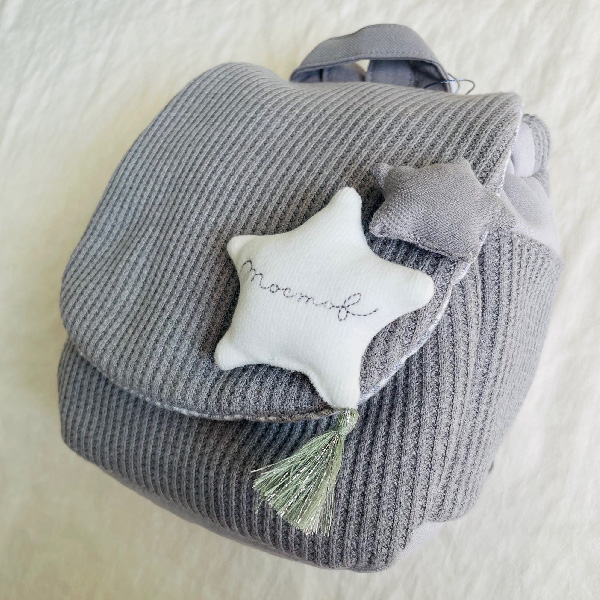おしゃれママの間で人気のグレーのベビーリュック♪大きな星とタッセルが付いておりおしゃれ度アップ!落ち着いた色合いで、普段使いはもちろん、フォーマルシーンにもぴったりです。