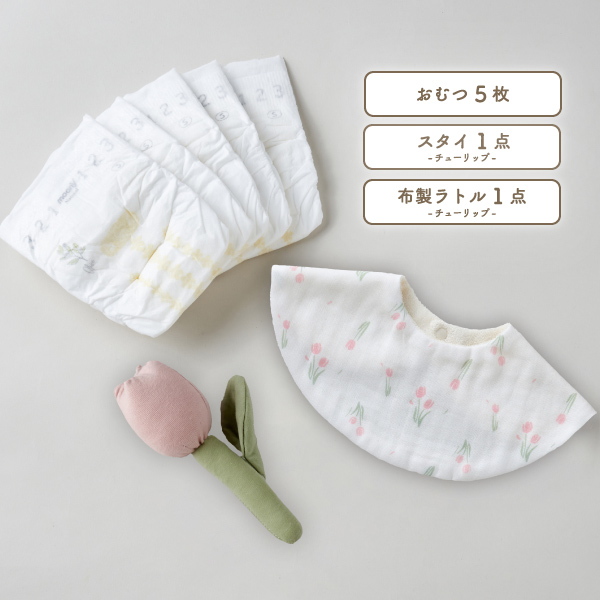| ・おむつ5枚(テープSサイズ/ナチュラルムーニー) ・チューリップスタイ ・チューリップラトル |