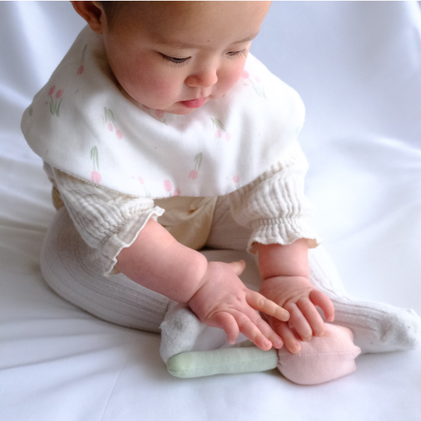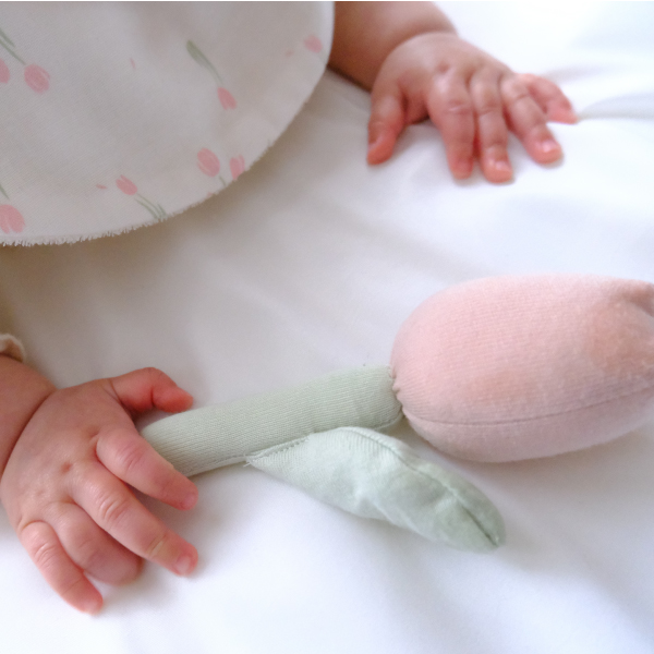 ラトルは、お子さまが握りやすいサイズでファーストトイにおすすめ。お花を持っている姿は、思わず写真を撮りたくなる可愛さ♪振ると優しい音がなるので、お子さまの気分もウキウキ♪