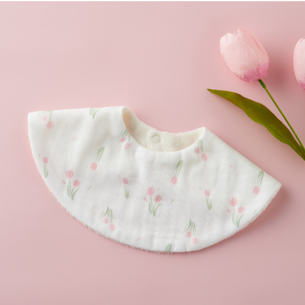 女の子におすすめなホワイト生地に淡いチューリップのプリントがとってもキュートなスタイは、ラウンドタイプでしっかりとよだれをキャッチしてくれます。主張しすぎないデザインで、色んな洋服に合わせることができます。