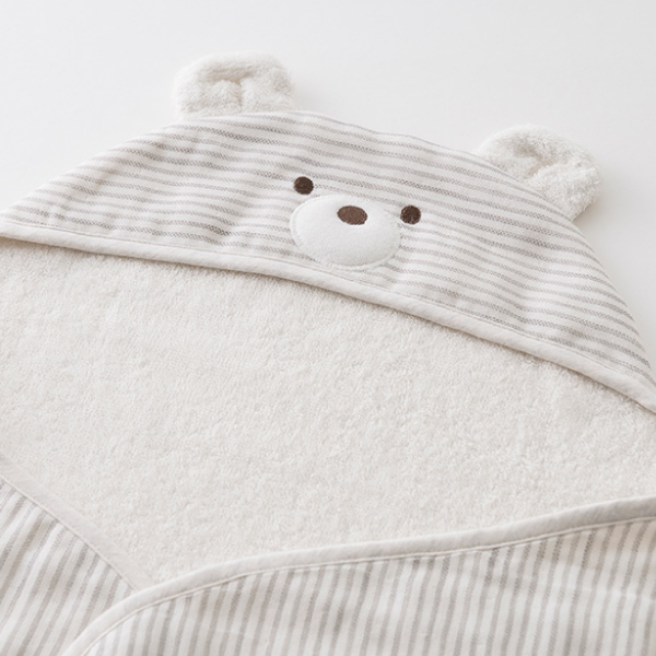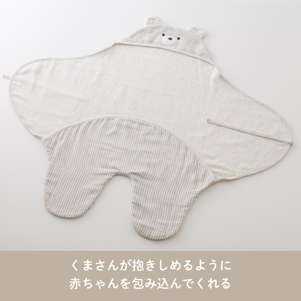 くまさんがぎゅっと抱きしめているようなとっても可愛いおくるみは出産祝いにおすすめなギフトです。