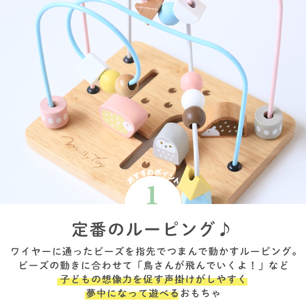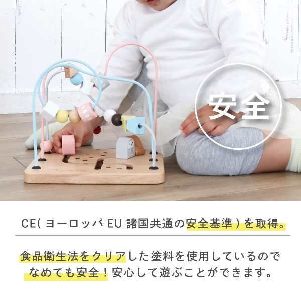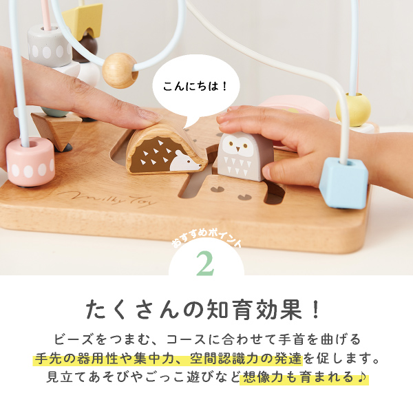 丸・三角・四角・台形など色んな形のビーズを指でつまんでくるくるビーズ遊び、動物たちを動かしてごっこ遊びで、またビーズと動物で物語を作ったりと、長く遊んで頂けます。