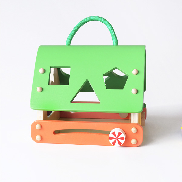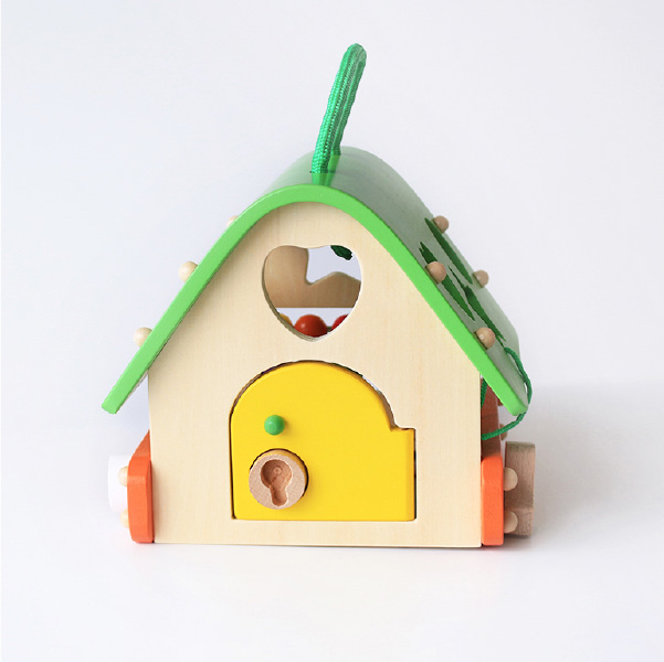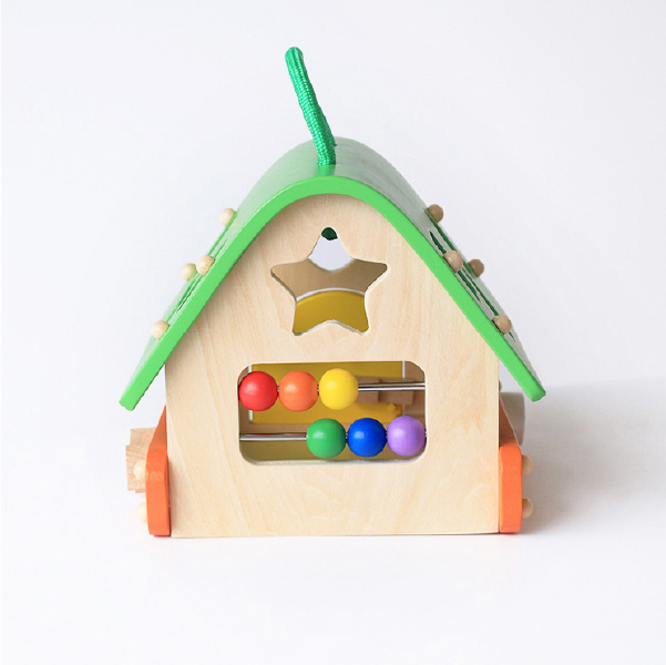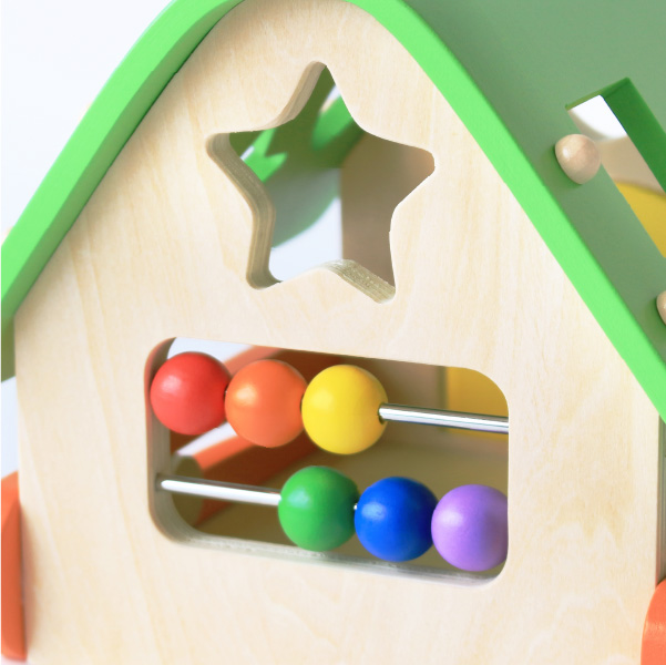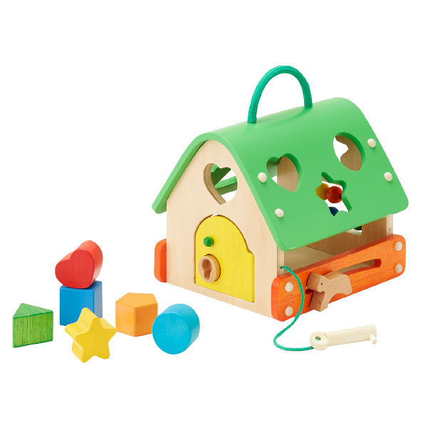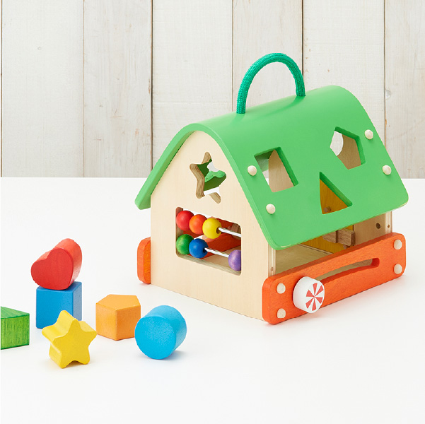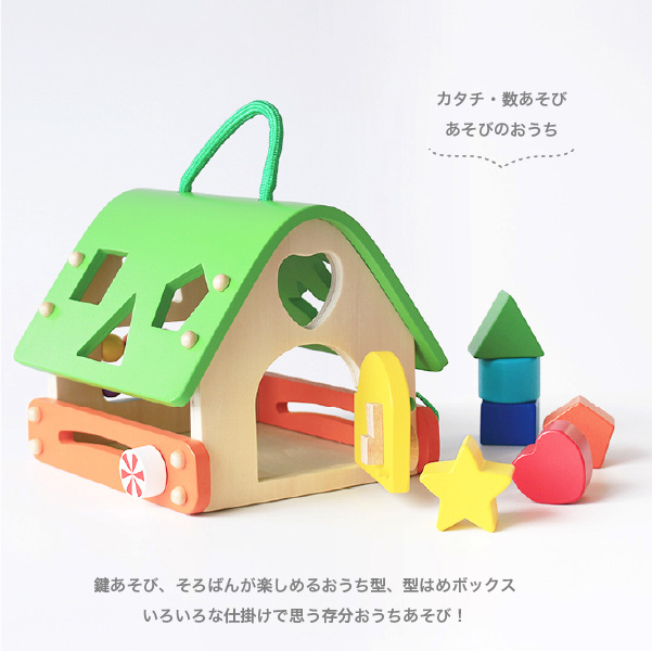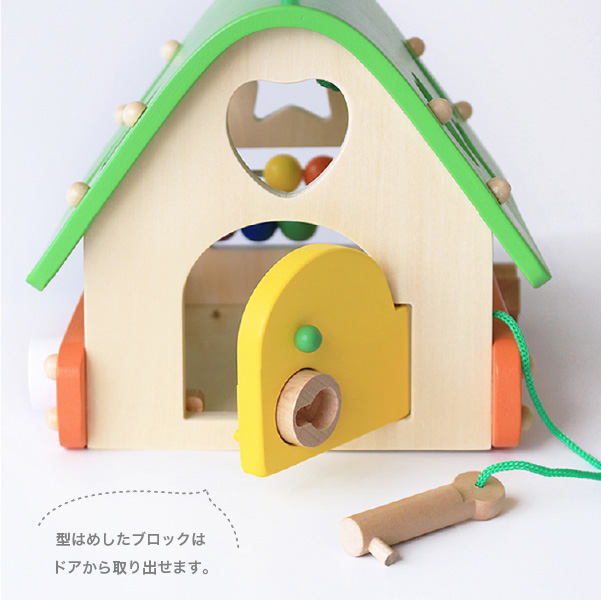 鍵あそび、そろばんが楽しめるおうち型、型はめボックスです。